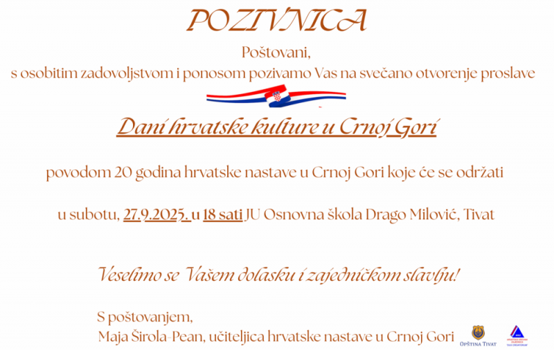 Hrvatska nastava u Crnoj Gori ove godine obilježava vrijedan jubilej – 20 godina uspješnog djelovanja. Povodom ove značajne obljetnice, tijekom jeseni se organizira kulturno-umjetnička manifestacija “Dani hrvatske kulture u Crnoj Gori”, u suradnji s Hrvatskom krovnom zajednicom Dux croatorum, te uz potporu javnih i kulturnih ustanova zemlje domaćina.