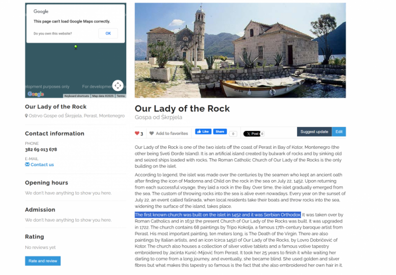 Naime, na internetskoj stranici  museu.ms ( Museums of the World) se u sekciji museu.ms/museum/details/188/our-lady-of-the-rock   pod oznakom Gospa od Škrpjela ( Our Lady of the Rock)  u trećem pasusu nalazi rečenica u kojoj piše ,, The first known church was built on the islet in 1452 and it was Serbian Orthodox. It was taken over by Roman Catholics and in 1632 the present Church of Our Lady of the Rocks was built. It was upgraded in 1722. '' I onima koji slabije razumiju engleski jezik  vjerujemo da ne treba  posebna stručnost da bi razumjeli da u tekstu stoji  da je prva  izgrađena crkva na Otoku Gospe od škrpjela bila  građena od strane Srpske pravoslavne crkve 1452. godine, koju su kasnije preuzeli rimokatolici  i 1632. izgradili crkvu koju su nadogradili 1722. '' ??!!