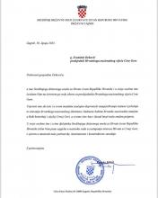 U svoje osobno ime i u ime djelatnika Središnjega državnoga ureda za Hrvate izvan Republike Hrvatske želim Vam puno uspjeha u nastavku rada u zastupanju interesa Hrvata u Crnoj Gori, s vjerom u nastavak naše partnerske, kontinuirane i konstruktivne suradnje.