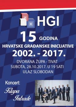 Hrvatska građanska inicijativa će u subotu, 28. listopada, proslaviti 15 godina od osnutka stranke, te će tom prigodom članovima, simpatizerima, Gradu i svim ljubiteljima dobre glazbe pokloniti koncert poznate hrvatske klape „Intrade“ iz Zadra.