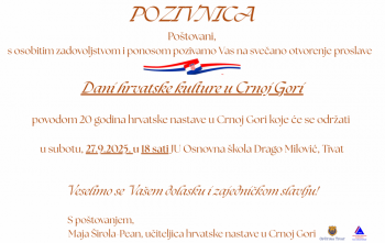 Hrvatska nastava u Crnoj Gori ove godine obilježava vrijedan jubilej – 20 godina uspješnog djelovanja. Povodom ove značajne obljetnice, tijekom jeseni se organizira kulturno-umjetnička manifestacija “Dani hrvatske kulture u Crnoj Gori”, u suradnji s Hrvatskom krovnom zajednicom Dux croatorum, te uz potporu javnih i kulturnih ustanova zemlje domaćina.
