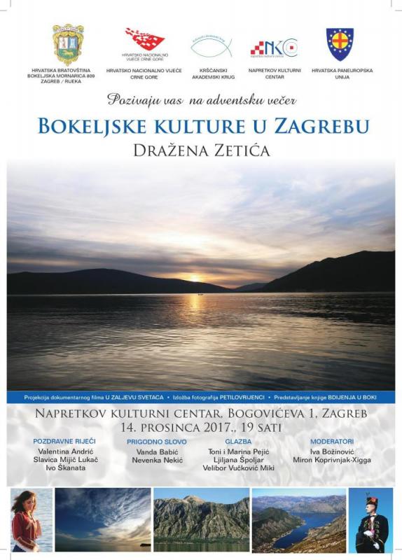 Adventska večer „Bokeljske kulture u Zagrebu“ Dražena Zetića održat će se u Napretkovom kulturnom centru u Zagrebu, 14. prosinca, s početkom u 19 sati.