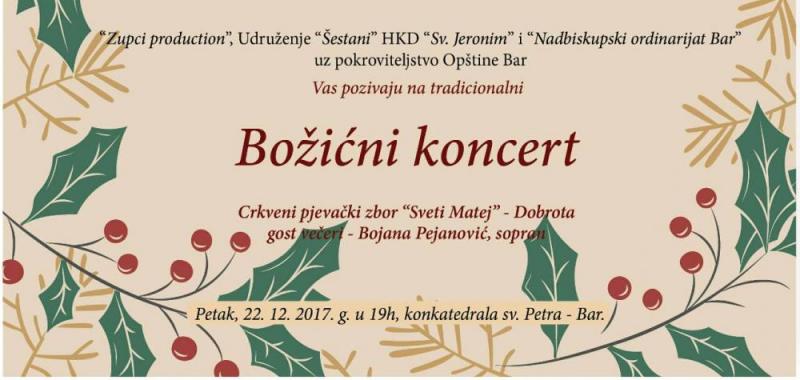 „Zupci production“, Udruženje „Šestani“, HKD „Sv. Jeronim“ i Nadbiskupski ordinarijat Bar uz pokroviteljstvo Općine Bar pozivaju vas na Božićni koncert, na kome će nastupiti crkveni pjevački zbor „Sveti Matej“ – Dobrota i sopranistica Bojana Pejanović.