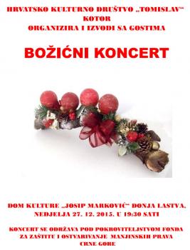 U nedjelju, 27. prosinca, u Domu kulture "Josip Marković" u Donjoj Lastvi s početkom u 19: 30 bit će održan Božićni koncert koji organizira HKD Tomislav iz Kotora. Na koncertu će nastupiti dječji zbor "Leptirići" s voditeljicom prof. Nadom Baldić. Na sceni će se također pridružiti i drugi glazbenici - gosti dječjeg zbora Leptirići. Koncert se realizira pod pokroviteljstvom Fonda za zaštitu i ostvarivanje manjinskih prava Crne Gore.