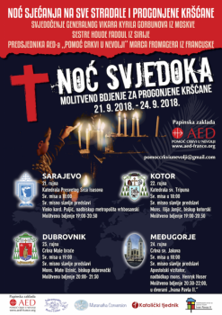 U kotorskoj katedrali će se 22. rujna (subota) s početkom u 19,30 sati održati večer molitve i bdijenja za sve progonjene kršćane u svijetu pod nazivom „Noć svjedoka“. Prije bdijenja biti će i sveta misa u 18 sati. Ovaj događaj ubraja se u važnije molitvene događaje u svijetu i već deset godina održava u različitim zemljama, a prenose ga različite TV postaje i važniji mediji. Po prvi puta se organizira na području Balkana (u Dubrovniku, Međugorju, Kotoru i Sarajevu).