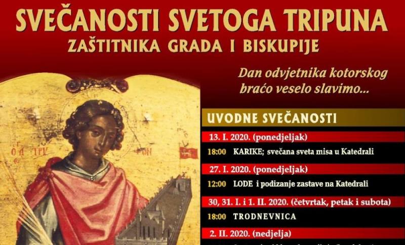 U ponedjeljak, 27. I., Lode – pohvale u čast sv. Tripuna izreći će ovogodišnji Mali admiral Karlo Ribica. Od 30. do 1. II. svaki dan, s početkom u 18 h bit će trodnevna duhovna priprava.
